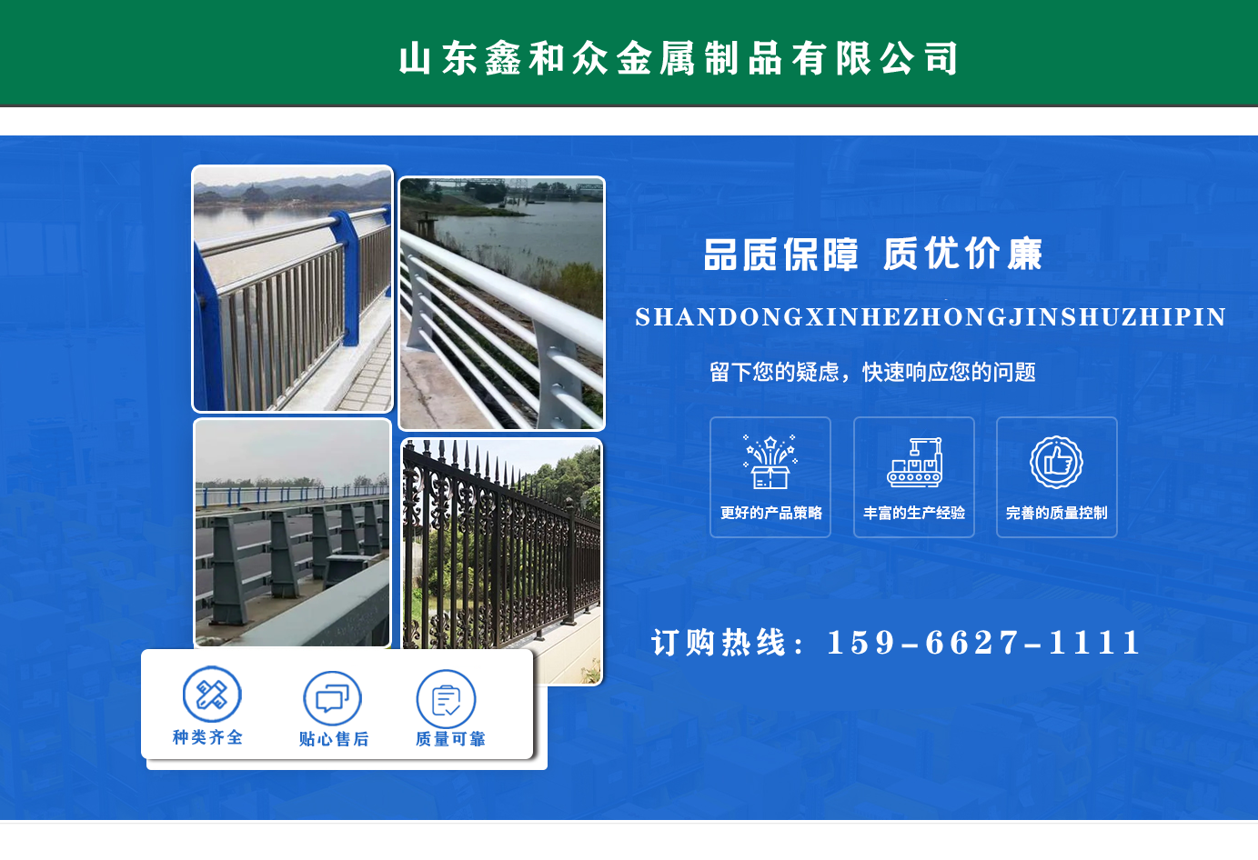 山東鑫和眾金屬制品有限公司主要產品有防撞護欄,橋梁護欄,道路護欄,河道護欄,不銹鋼護欄等護欄。提供設計方案,一站式定制,包您滿意價格優惠,歡迎來電咨詢! 公司常年從事銷售護欄防撞護欄,橋梁護欄,道路護欄,河道護欄,不銹鋼護欄,橋梁鋼護欄,河道燈光護欄等。產品廣泛應用于橋梁、河道、旅游景區、道路、公路、公園、小區、景觀、道路防撞等領域。 公司產品均采用優質不銹鋼材料,符合相關標準。各種型號不銹鋼復合管及護欄,質量嚴格把控。產品強度高、耐腐蝕、焊接牢固、抗沖擊、性能好,防撞護欄結構簡單、美觀實用大方。 歡迎前來訂購!...